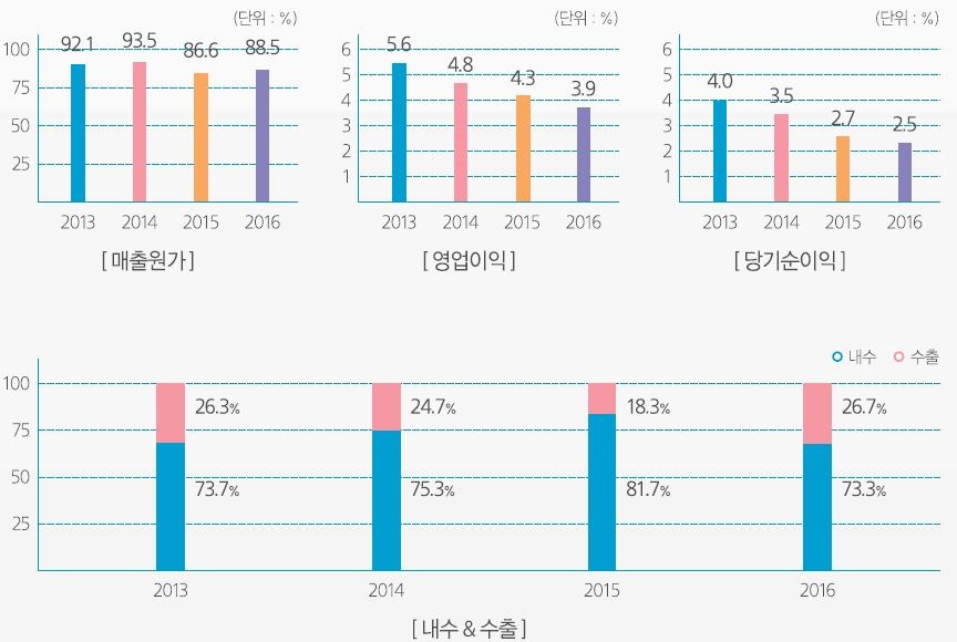 매출원가는 매출액의 92~93% 수준이던 것이 2015년부터 2016년까지 90%를 하회하고 있으며, 영업이익율은 5.6%에서 3.9%로, 당기순이익율은 4%에서 2.5%로, 지속적인 하락세를 보이고 있다.