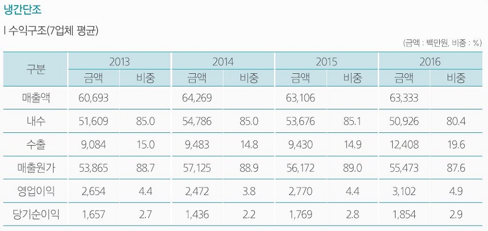냉간단조 분야의 수출비중은 2013년 15%에서 지난해 19.6%로 커졌는데, 단조조합은 비철금속 단조품의 수출 증가가 작용했을 것으로 보고 있다. 더불어 매출원가는 매출액의 88~89%를 유지하고 있으며, 영업이익율은 4.4%에서 4.9%로, 당기순이익율은 2.7%에서 2.9%로 소폭 올랐다.