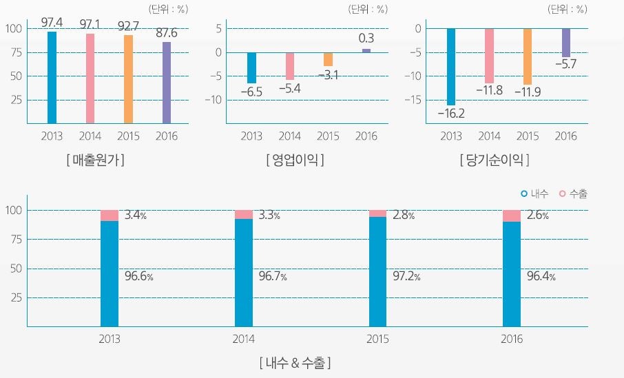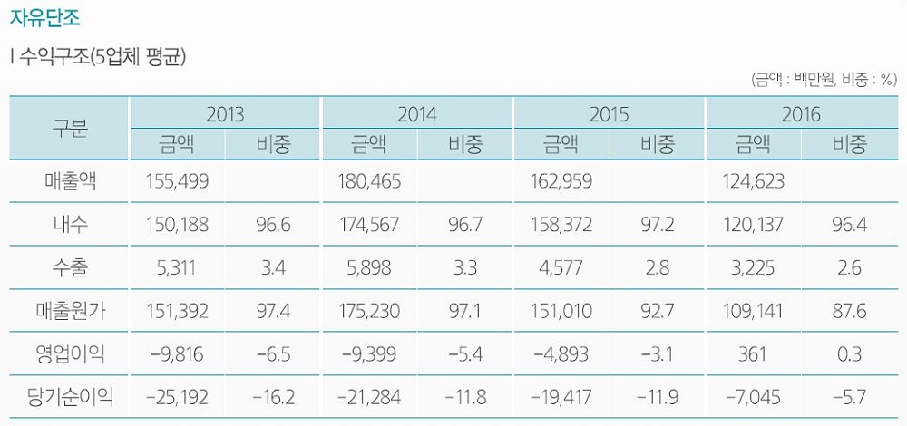 자유단조 분야의 수출비중은 3% 내외로 매출의 대부분이 국내에서 발생한다. 매출원가가 매출액과 비슷한 추세로 이어지다가 지난해 소폭의 영업이익이 발생했으나 당기순이익에서는 여전히 적자가 이어지고 있다. 매출액 대비 매출원가 비중 또한 지속적으로 낮아지고 있다.