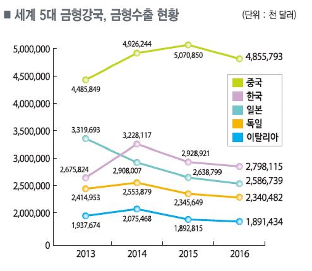 한국금형공업협동조합(이사장 박순황)에 따르면 국제 산업 분류 HSK Code를 기반으로 우리나라와 세계 시장에서 경쟁하고 있는 세계 5대 금형강국인 일본, 중국, 독일, 미국, 이탈리아의 금형 수출입 현황을 조사한 결과 2016년 우리나라 금형수출 규모가 세계 2위를 기록한 것으로 나타났다.