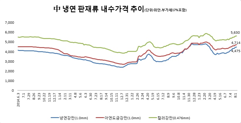 국내 냉연 제조업체들도 7월부터 일제히 가격인상에 나서고 있는데 8~9월 가격인상에 긍정적 영향을 미칠 전망이다. 다만 중국 내수 시장가격이 하락 전환되면 국내 가격도 출렁일 수 있어 업계 내에서도 중국 가격 동향을 주시하고 있다.