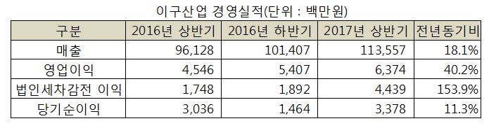 신동업체인 이구산업(대표이사 손인국)의 지난 상반기 경영실적이 모든 항목에서 호조를 보였다.