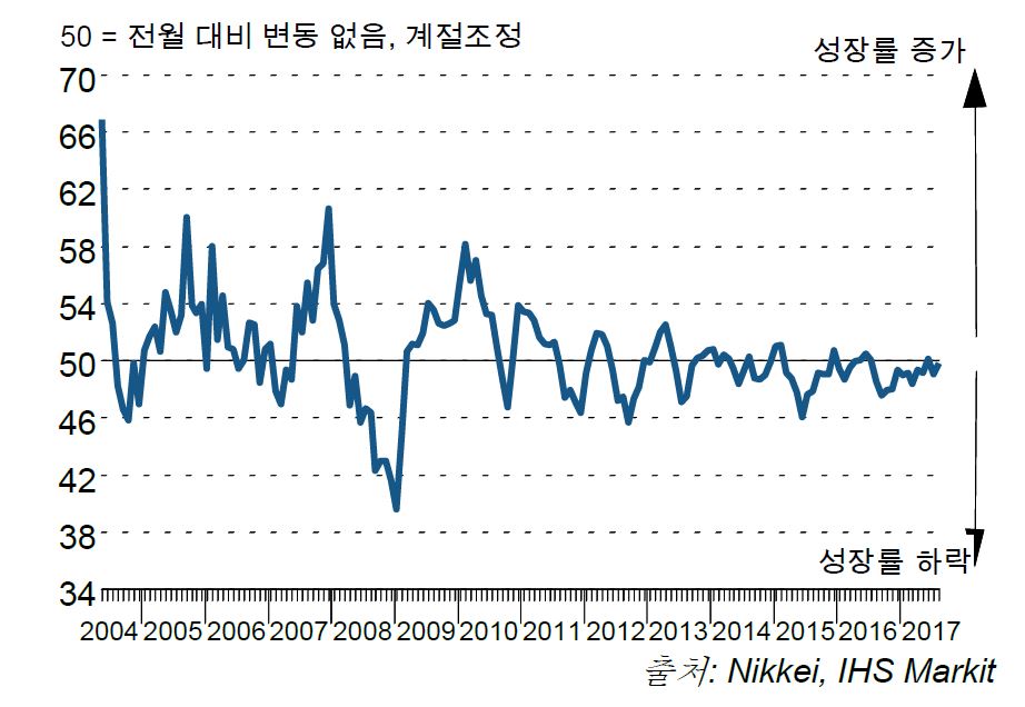 니케이(Nikkei)와 마킷(Markit)이 조사한 지난 8월 한국 제조업 구매관리자지수(PMI)는 49.9을 기록하면서 7월의 49.1에 비해 0.8포인트 증가한 것으로 나타났다.