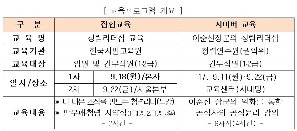 이번 청렴교육은 한국시민교육원 장동군 원장이 ‘더 나은 조직을 만드는 청렴리더’를 주제로 청렴의 본질적 의미와 청렴한 조직이 되기 위한 리더의 역할 등에 대해 강의를 진행할 예정이다.