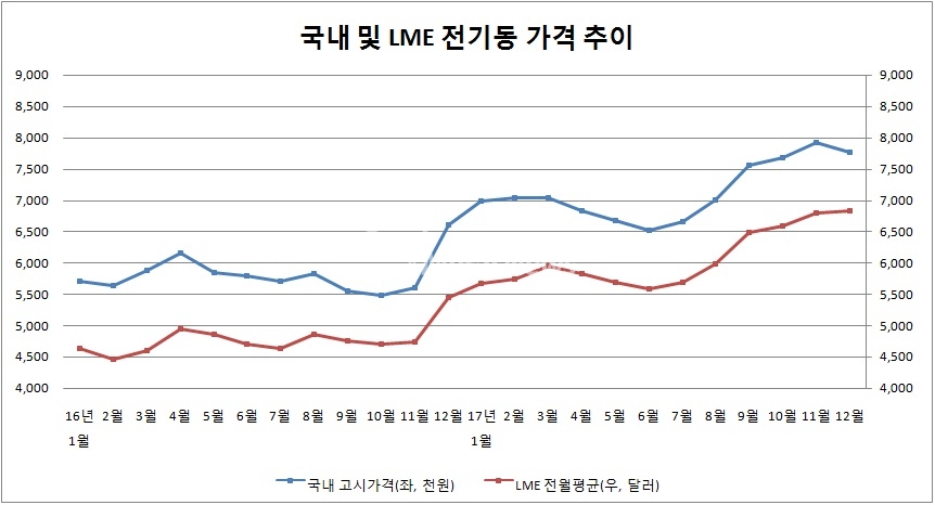 이달 국내 전기동 고시가격이 6개월 만에 하락했다. 런던금속거래소(LME) 월평균가격이 소폭 올랐지만 원-달러 환율이 약세를 보이면서 하락 전환했다.