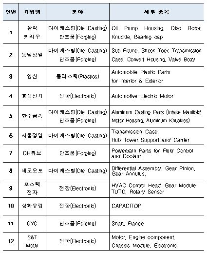 이번 사업에는 사전에 마그나 측 심사를 거친 엔진, 파워트레인, 기어박스, 내외장재 분야 국내 중소·중견 자동차부품 기업 12개가 참가한다. 마그나 측에서는 구매책임자, 엔지니어, 품질관리담당 등 실무자 50여명이 참석한다.