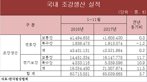 1~11월 국내 전기로강 생산은 2,150만7,674톤을 기록해 전년 동기 1,928만4,450톤에 비해 11.5%나 증가했다.