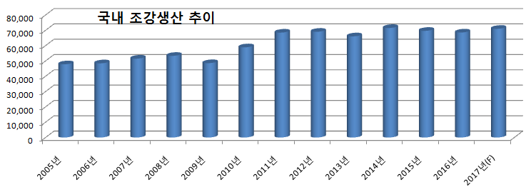 올해 국내 조강생산은 건축경기 호조의 영향으로 봉형강류 생산이 크게 증가하면서 전기로강 생산이 증가를 주도했다. 전체 조강생산에서 전기로강이 차지하는 비중도 33.0%로 높아졌다.