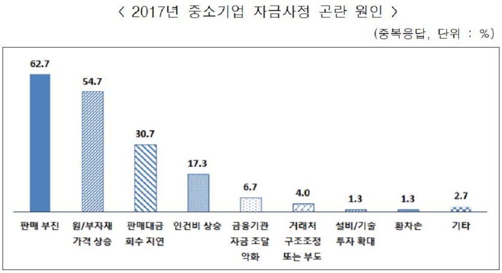 중소기업중앙회(이하 중기중앙회)가 발표한 이번 조사결과에서 자금사정 곤란 원인으로 ‘판매 부진’이 62.7%로 가장 높았고, 이어 ‘원·부자재 가격 상승(54.7%)’, ‘판매대금 회수 지연(30.7%)’ 순으로 나타났다.