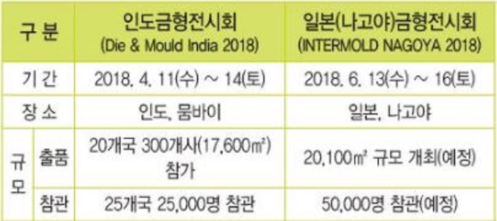 이와 별도로 금형조합은 조합원사의 해외 신규 및 틈새시장 개척을 위하여 정부지원 전시회 외에도 수출 유망지역인 인도와 일본 나고야에서 개최하는 전시회의 개별참가를 지원한다.