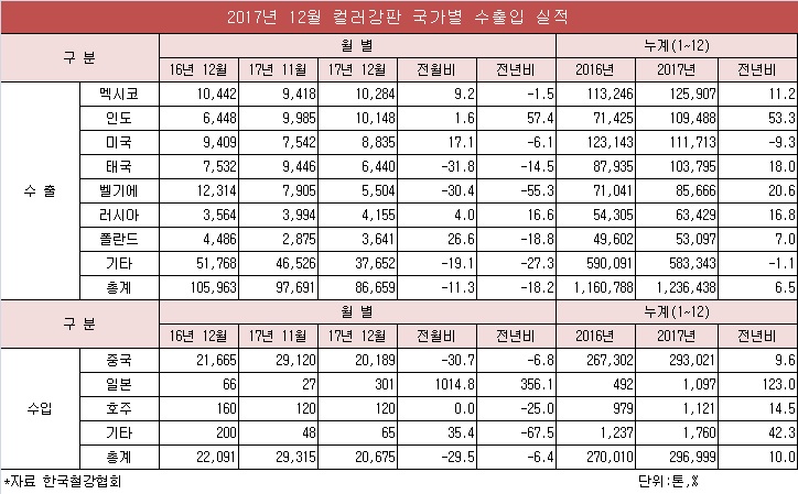 2017년 컬러강판 총 수출량은 123만6,438톤으로 전년 동기 대비 6.5% 증가한 것으로 나타났다.