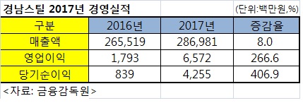 포스코 가공센터 경남스틸(대표 최충경)은 지난해 개별 재무제표 기준 영업이익이 65억7,200만원으로 전년대비 266.6% 증가했다고 6일 공시했다.