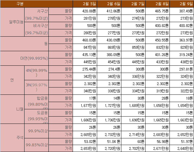 2월 8일 조달청 비철금속 비축물자 방출가격