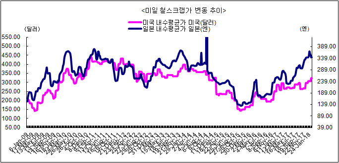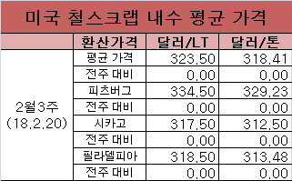 평균 가격 결정에 영향을 미치는 피츠버그는 전주 대비 보합인 톤당 329.23달러, 시카고는 전주 대비 보합인 톤당 317.50달러를 나타냈다. 필라델피아 역시 전주 대비 보합인 톤당 313.48달러를 기록했다.