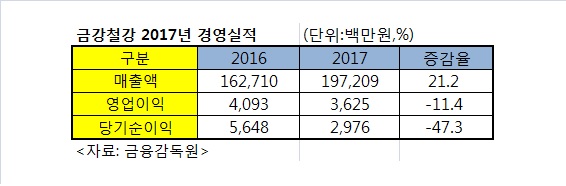포스코 가공센터 금강철강(대표 주광남, 주성호)이 연결 재무제표 기준 지난해 영업이익이 36억2,500만원으로 전년대비 11.4% 감소했다고 22일 공시했다.