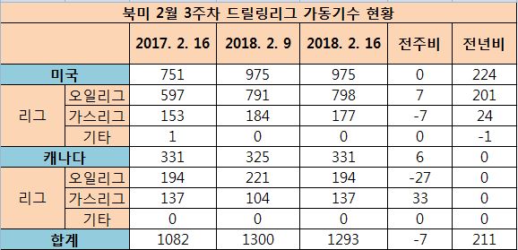 2월 3주차 북미지역 굴착기(Drilling Rig) 가동기수는 총 1,293기로 지난해 같은 기간 1082기 보다 211기 증가했다.