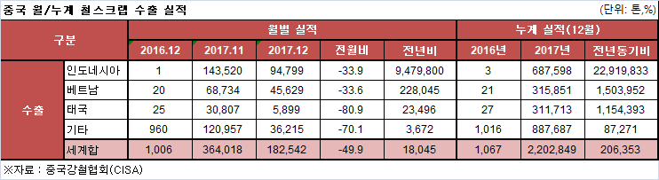중국의 지난해 철스크랩 수출량이 2016년 1천톤과는 차원이 다른 220만톤 대를 기록했다. 당초 예상보다도 10% 높아지면서 이제 중국의 철스크랩 수출이 본격 궤도에 진입하고 있다는 분석이 나오고 있다.