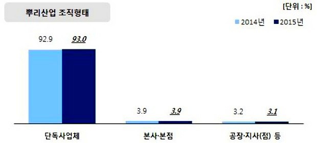 8일 국가뿌리산업진흥센터에 따르면 지난해 모두 5만4428개사 가운데 뿌리센터의 설문조사에 응한 2만6840사 중 단독사업체가 93%(2만4961사)로 전년(2만7141사)보다 0.1%포인트 상승했다.