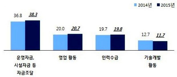 이어 이들 업체는 영업활동(20.7%), 인력 수급(19.8%), 기술개발(11.7%)에 대해서도 고충을 겪고있다고 토로했다.
