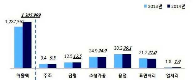 전체 매출 가운데 용접은 30.1%의 비중으로 최고를 기록했지만, 전년보다 0.1%포인트 비중이 축소됐다. 표면처리는 21%의 비중을 차지했으나 역시 전년보다 0.2%포인트 하락했다.