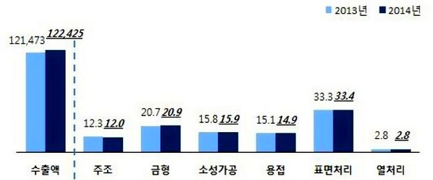 이 기간 수출 비중은 0.1%포인트 상승하면서 표면처리가 33.4%로 1위를 차지했다. 이어 금형 20.9%(0.2%↑), 소성가공 15.9%(0.1%↑), 용접 14.9%(0.2%↓), 주조 12%(0.3%↓), 열처리 2.8%(보합) 순으로 비중이 높았다.