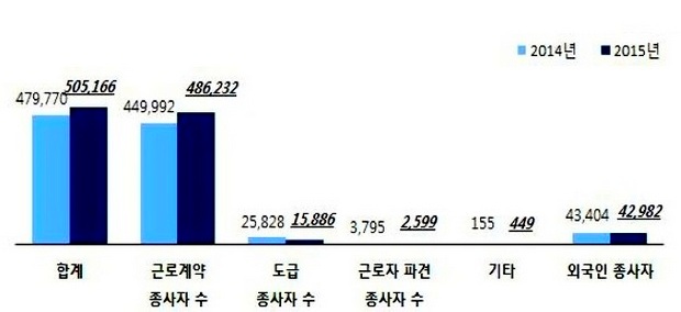 반면, 이 기간 내국인 종사자 비중은 86.8%(36만5262명)에서 91%(43만6366명), 91.5%(46만2184명)로 각각 상승해 비중과 종사자 수 모두 증가했다.