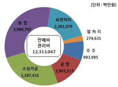 업종별로 보면 용접이 3조 9947억 9700만원(32.4%)으로 6개 업종 가운데 판관비 비중이 가장 높았고, 이어 소성가공이 3조 1874억 3100만원(25.9%), 표면처리가 2조 2010억 7900만원(17.9%)으로 그 뒤를 따랐다.