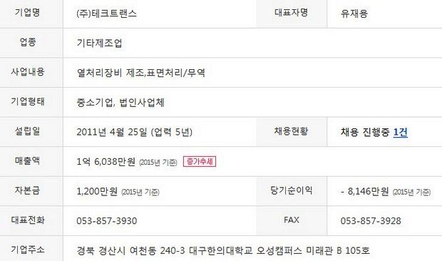 한편, 테크트렌스는 기술의 우수성을 인정받아 삼성벤처투자에서 23억원의 투자 유치에 성공했으며, 올해 매출은 30억원 이상으로 전년(1억6000만원)보다 급증할 전망이다.