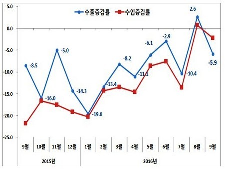 14일 산업통상자원부가 이달 초 발표한 ‘2016년 수출입 동향’에 따르면 우리나라의 1월∼9월 수출은 6582억달러로 전년 동기(7269억달러)보다 10% 가량 감소했다.