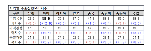 수입국경기지수는 46.9(+1.3)로 비교적 낮았다. 지역별로는 북미와 아시아가 각각 58.9(+12.0), 55.8(+6.6)로 크게 호전되었으나 브렉시트(Brexit, 영국의 유럽연합 탈퇴)의 불확실성이 높은 유럽과 저유가로 휘청이는 중동의 경기가 각각 52.2(-5.3), 35.5(-3.7)로 낮게 평가됐다.