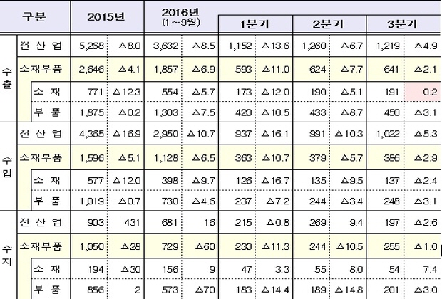 산업부는 수출과 수입, 무역수지 감소율이 둔화 추세를 보이고 있으며, 소재부문이 3분기 들어 증가세로 전환했다고 밝혔다. 소재·부품 1분기 수출은 11.0% 감소했지만, 2분기 -7.7%에 이어 3분기 -2.1%로 감소 폭이 줄었다. 소재 분야는 1분기와 2분기에 각각 12.0%, 5.1% 감소했지만, 3분기에 0.2% 상승 반전했다.