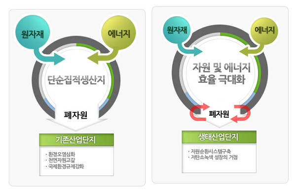 EIP(Eco-Industrial Park)는 산업단지에서 발생되는 부산물과 폐열을 다른 기업의 원료나 에너지로 재사용하여 자원 효율성을 제고하고 환경오염을 최소화하는 이른바 ‘생태산업단지 구축사업’이다.