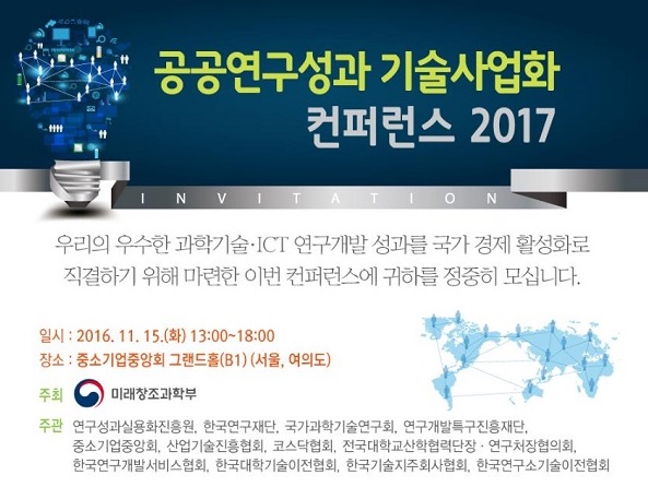 한국생산기술연구원은 오는 15일 서울 여의도 중소기업중앙회 그랜드홀에서 ‘공공연구성과 기술사업화 컨퍼런스 2017’을 개최한다.