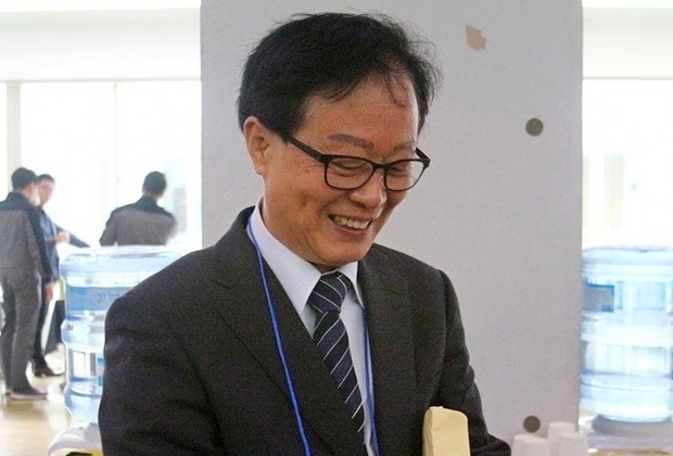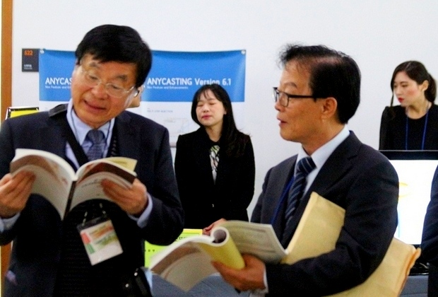 이들은 웃으면서 본지 카메라를 향해 “오후 열리는 (차지 회장이 학정되는)총회 전까지는 모른다”고 입을 모았다. 이들 신구 회장이 학술 행사 전에 대화를 나누고 있다. 이날 조 신임 회장은 제1 발표장에서 세번째 연사로 나서 ‘중국 주조업종 3차 5개년 발전 기획과 2015년 업종 데이터’를 발표했다. 조 신임 회장 발표를 권 회장이 듣고있다. 발표가 끝나고 권 회장이 조 신임 회장에 강연 감사패를 수여했다.