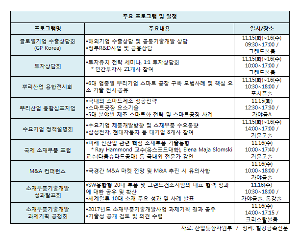 특히 Ray Hammond 교수(영국 옥스퍼드대), Elena Maja Slomski 교수(독일 다름슈타드공대), 히로시 이와츠보 부사장(일본 무라타메뉴팩처링사) 등의 신산업전문가들이 4차 산업혁명 관련 산업과 소재부품 기술개발 최신 동향을 논의하는 ‘국제 소재부품 포럼’과 삼성전자, 현대자동차 등 주요 업종을 대표하는 수요기업 8개사가 참석해 소재부품·뿌리기업 대상으로 최신 기술 동향과 제품 개발 전략, 수요 기술 등을 소개하는 ‘수요기업 정책설명회’, 미국 플로어, 중국 화웨이, 일본 미쓰비시 히타치 파워 등 글로벌기업 60개사들이 국내 소재부품기업 340여 개사와 1:1 상담을 통해 수출, 공동연구, 기술협력 등 협업방안을 논의하는 ‘글로벌기업 수출상담회’가 큰 기대를 모으고 있다.