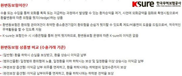 한편, 환변동보험 가입과 관련해 무역보험공사는 수출중소기업의 환위험관리를 지원하기 위해 개별거래건 위주의 일대일 컨설팅 시스템을 구축해 운영하고 있다.