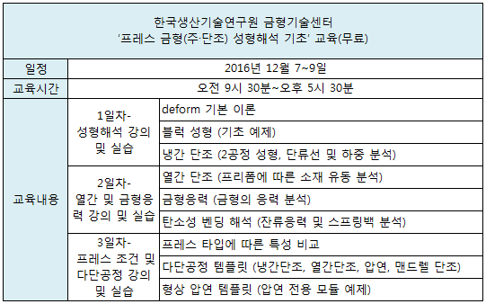 다음 달 7일부터 9일까지 매일 오전 9시 30분에 시작해 오후 5시 30분에 끝나는 이 교육을 통해 참가자들은 단조 및 소성가공 성형해석의 이론(성형해석의 결과 분석 방법과 소성가공 공정별 해석기술에 대한 내용 포함)을 이해하고 소성가공 성형해석 SW인 deform의 사용법을 배우게 된다.