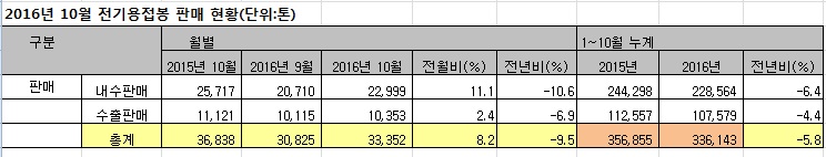 한국철강협회 자료에 따르면, 지난 10월 전기용접봉 판매(내수+수출)는 3만3,352톤을 기록하며 전년대비 9.5% 감소했다.