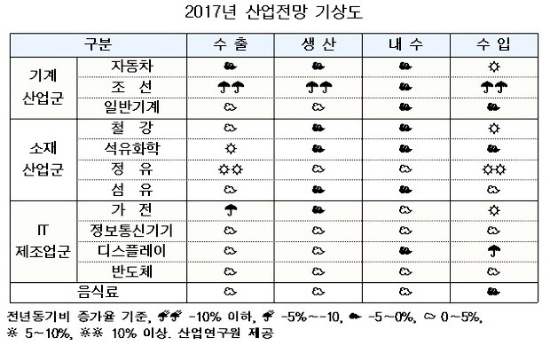 이들 산업의 내년 생산증가율 전망치는 자동차 –3.6%(2016년 –7.9%), 조선 –12.3%(-3.9%), 철강 –0.6%(1%), 가전 –0.9%(-1.9%) 모두 역성장할 전망이다. 반면, 일반기계의 경우 –2.3%에서 1.4%로 성장이 예상된다.