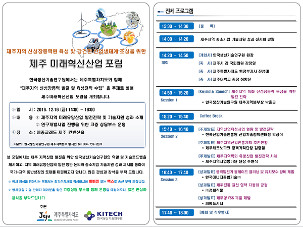 한국생산기술연구원이 제주특별자치도와 함께 오는 16일 메종글래드제주 컨벤션홀에서 ‘2016년도 제주 미래혁신산업 포럼’을 개최한다.