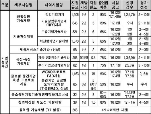 중소기업청이 중소중견기업의 신기술·제품 개발과 공정혁신 등 기술경쟁력 향상을 위해 2017년 중소·중견기업 기술개발 지원사업’에 대한 추진 계획을 14일 밝혔다.
