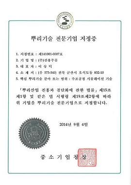 뿌리기술 전문기업 지정증 / 사진: 진흥주물