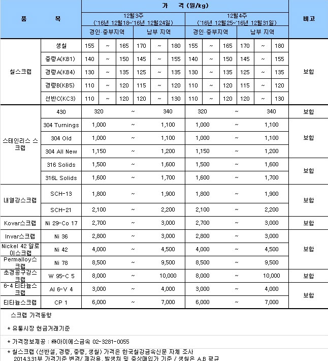 올해 12월 넷째 주(12월 25~12월 31일) 국내 철 스크랩 시황은 경인·중부지역, 남부지역 모두 보합을 나타냈다.