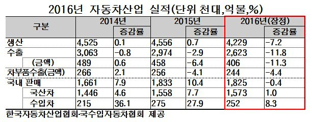 산업통상자원부가 지난해 자동차산업 실적(잠정)을 집계한 결과, 생산 7.2%, 국내 판매 0.4%, 수출 11.8% 각각 감소했다고 11일 밝혔다.