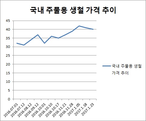 한편 주물용 생철 가격은 종전대비 톤당 41~42만원 수준을 나타냈다.