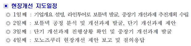 지도위원들은 선정된 12개 제조 중소·중견기업들을 다음 달 10일(월)에서 5월 12일(금) 사이 기업별로 4일씩 방문해 제품 개발, 원자재 구매, 생산, 판매 등 전 프로세스를 분석하고 품질·비용·납기 관리를 분석해 구체적인 개선안을 제안할 방침이다.