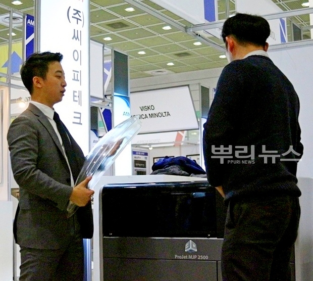 (왼쪽부터)CEP테크 직원이 한 중소기업 대표에게 MJP 2500과 이를 통해 생산한 플라스틱 제품에 대해 설명하고 있다. 정수남 기자