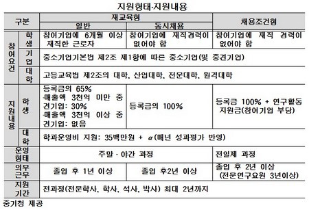 아울러 중기청은 학생에게 등록금의 65%까지 지원한다. 나머지는 기업과 학생이 각각 50%를 부담하면 된다.