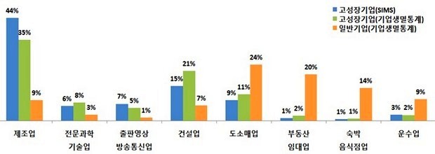 현재 국내 고성장기업은 일반기업에 비해 제조업과 전문 과학기술업 등 기술‧지식 집약적 업종에 상대적으로 많고, 평균업력은 8.2년으로 집계됐다. 업력 10년 이상인 기업의 수는 전체의 45.6%.