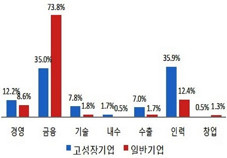 이는 일반기업이 금융 분야에서만 주로 정부 지원을 받지만, 고성장기업의 경우 기술혁신과 수출 등을 위한 기술, 수출, 인력 분야에서도 지원을 받기 때문이라는 게 중기청은 설명이다.